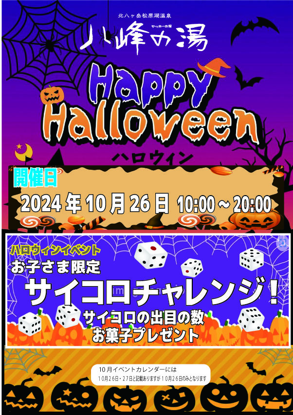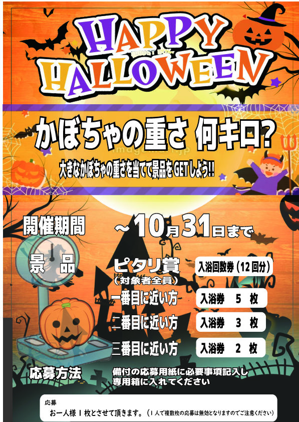 ハロウィンイベント お知らせ | 2024.10.24 (木) 緊急告知 です。ハロウィーンイベント開催10日26日 子ども限定企画 【サイコロチャレンジ】 (サイコロの数たげお菓子プレゼント!) 10月26日~31日まで 【かぼちゃの重さ何キロ?】かぼちゃを持って重さを当て入浴券をGETしよう « 前のページ 次のページ »