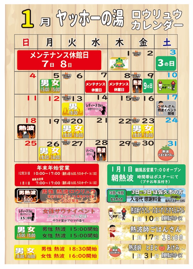1月イベントカレンダー お知らせ | 2025.12.27 (土) 1月の各種イベントカレンダーです1月1日は朝風呂・朝サウナ営業(7:00〜17:00 最終受付16:00)7日・8日はメンテナンス休館日カレンダーをご参考にしてください « 前のページ 次のページ »