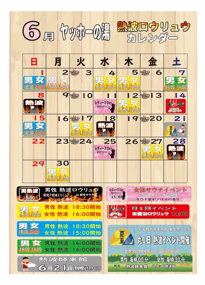 6月 イベントカレンダー お知らせ | 2025.05.25 (日) 6月イベントカレンダー(熱波イベント含む) 8日 コラボ記念抽選会 13日~15日 月替わり入浴剤 14日~ 桃屋コラボメニュー 21日 夏至祭 1日熱波イベント 21日 熱波師来館(夏至祭コラボ) « 前のページ 次のページ »