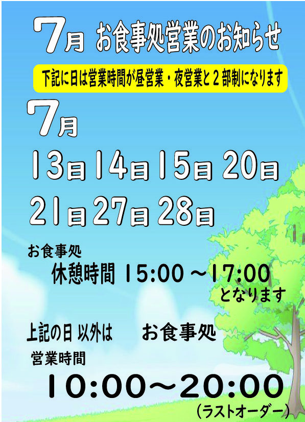 7月 お食事処営業時間について お知らせ | 2024.07.08 (月) 日頃より八峰の湯をご利用頂き誠のありがとうございます 7月のお食事処営業 ご案内でございます。ご理解ご協力お願いいたします。 « 前のページ 次のページ »