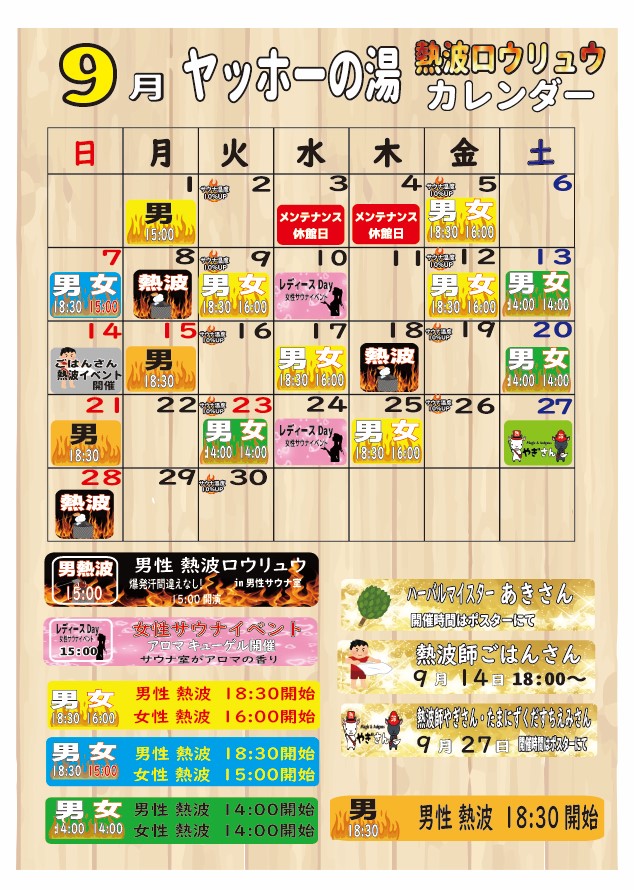 9月イベントカレンダー(熱波イベント) お知らせ | 2025.09.01 (月) 9月のヤッホーイベントカレンダー(熱波イベント含む) 3日・4日 メンテナンス休館日 5日〜7日 コスモスの湯(入浴剤) 14日 男性サウナ室ごはんさん 熱波(18:00) 27日 やぎさん& たまにずくだすちえみさん 調整中 ハーバルマスター あきさん 毎週 月・木曜日 不感の湯 (9月末まで延長) 毎週 火・金曜日 サウナ10%UPDay 8の付く日 男性サウナ室 熱波ロウリュウ 第2・4水曜日 女性サウナ室 アロマキューゲル « 前のページ 次のページ »