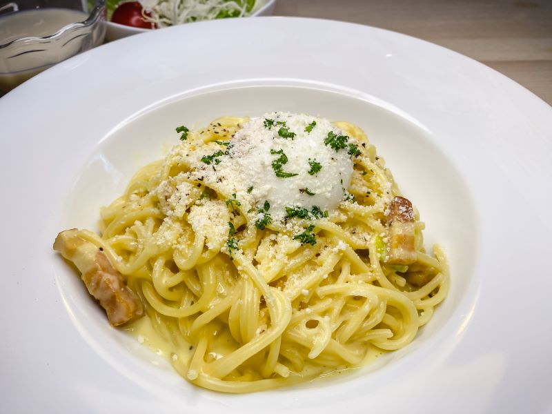 温泉たまごを添える事により濃厚なカルボナーラ。太めのパスタ麺がよく合う
