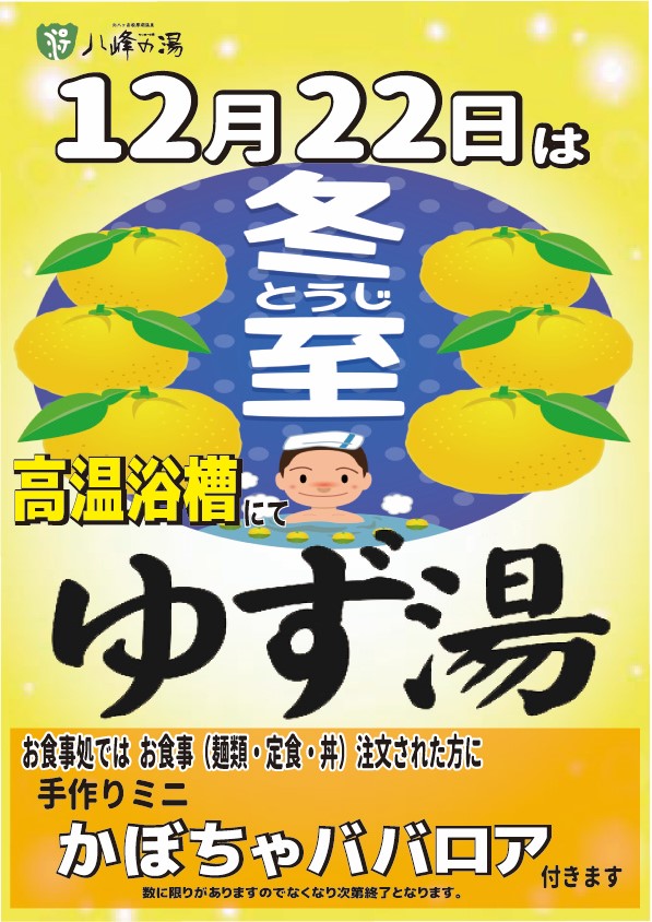 冬至の日(12月22日)はヤッホーへ お知らせ | 2023.12.11 (月) ヤッホーの湯では12月22日の冬至に向けてゆずを譲ってくださる方に当日の入浴代50円とさせて頂きます。ゆずって下さる期間は12月21日までです。12月22日は冬至高温浴槽にて ゆず湯 お食事処で 食事(麺類・丼物・麺類・定食)ご注文で かぼちゃのババロア が付きます。ヤッホーの湯のゆず湯で温まりましょう « 前のページ 次のページ »
