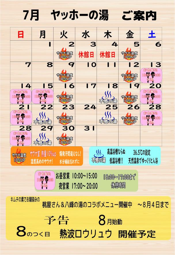 7月イベントカレンダー お知らせ | 2024.07.06 (土) 八峰の湯もイベントカレンダーを作ってみました7月からは不感の湯(高温浴槽を42.0℃から36.5℃)お食事処15:00~17:00まで休憩時間 を行いますご利用の皆様はカレンダーを参考にご利用ください « 前のページ 次のページ »